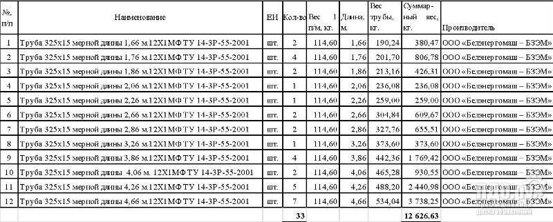 Труба бесшовная горячедеформированная котельная 325х15 мерной длины 12Х1МФ ТУ 14-3Р-55-2001. Производитель - ООО «Белэнергомаш – БЗЭМ» Суммарный объём — 12.626кг. Цена розница 190 р/кг. Цена 150 р/кг., при покупке всего объёма. Местонахождение — Самарская обл., г. Новокуйбышевск. Любая дополнительная информация — по запросу. Характеристики и длины труб см. на фото.